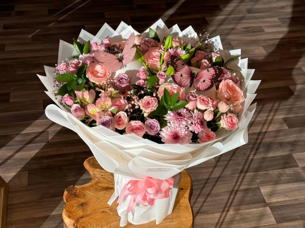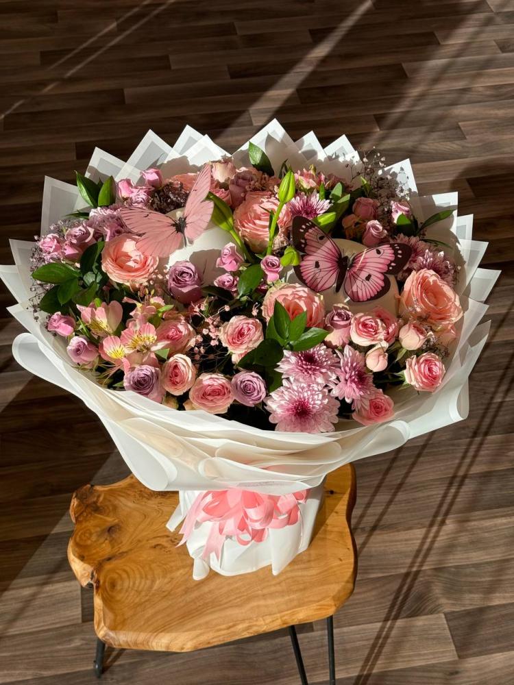 باقة واقفة على قاعدة اسفنجية لتغذية اطول وعمر ورد اطول مع تنسيق مكس وردي مع فراشات تناسب جميع المناسبات