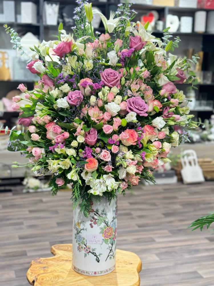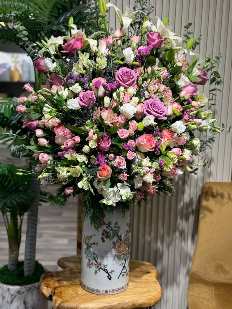 فازة فاخرة وكبيرة الحجم متنوعة بالزهور الجميلة والفاخرة