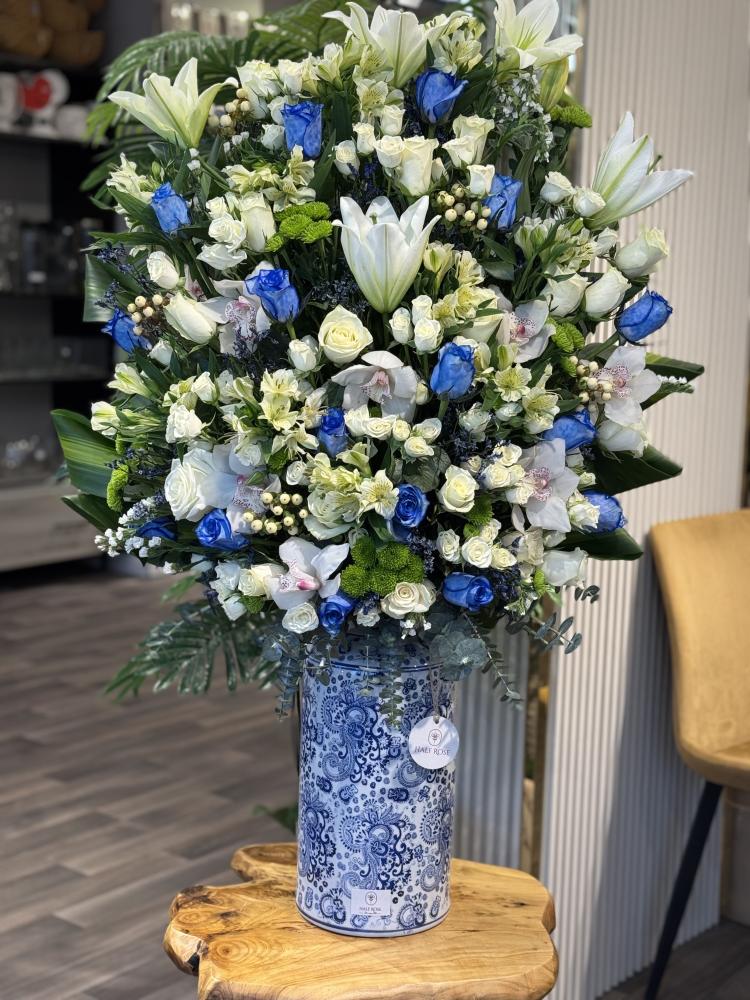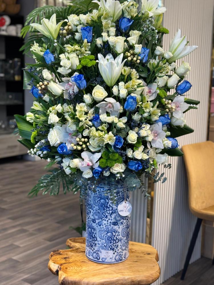 فازة فاخرة وكبيرة الحجم متنوعة بالزهور الجميلة والفاخرة